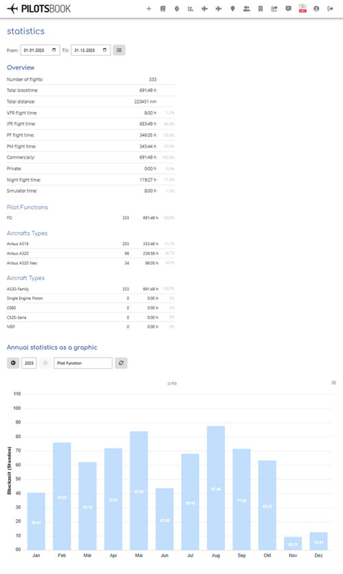 This website offers you the opportunity to enter all your flights for free. It is an electronic online logbook for pilots flying private or commercial, whether you fly a Cessna C172 or Boeing 747-400. You get an overview and statistics of your logged flights.Try pilotsbook before register